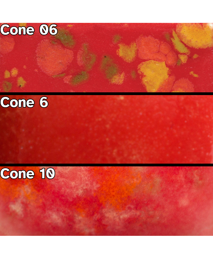 Cone 06 oxidation: Firecracker is an opaque red base glaze with orange, green, and yellow crystals.