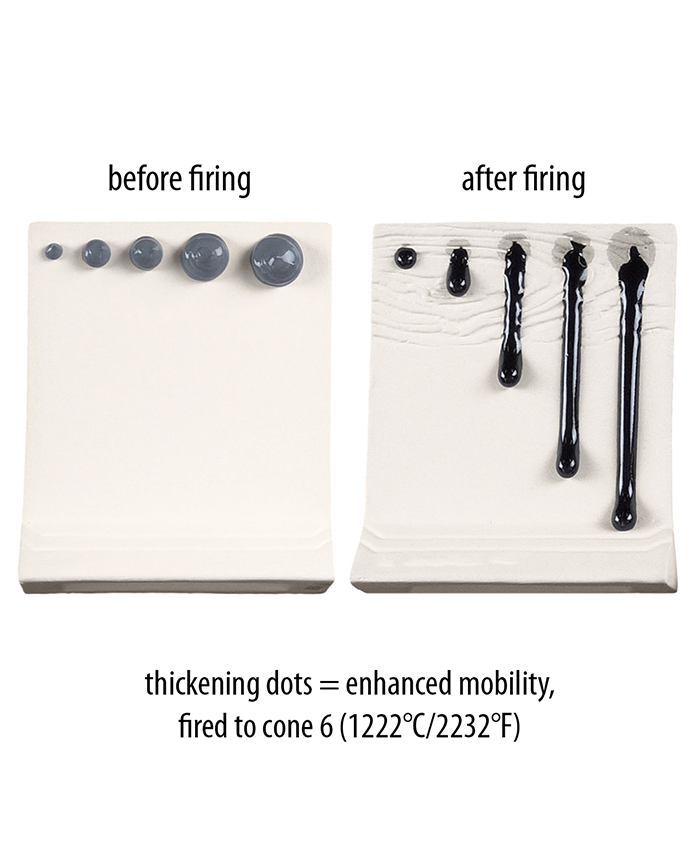 When applied as a horizontal line, the fired glaze effect may separate or break, turning into vertical drips.