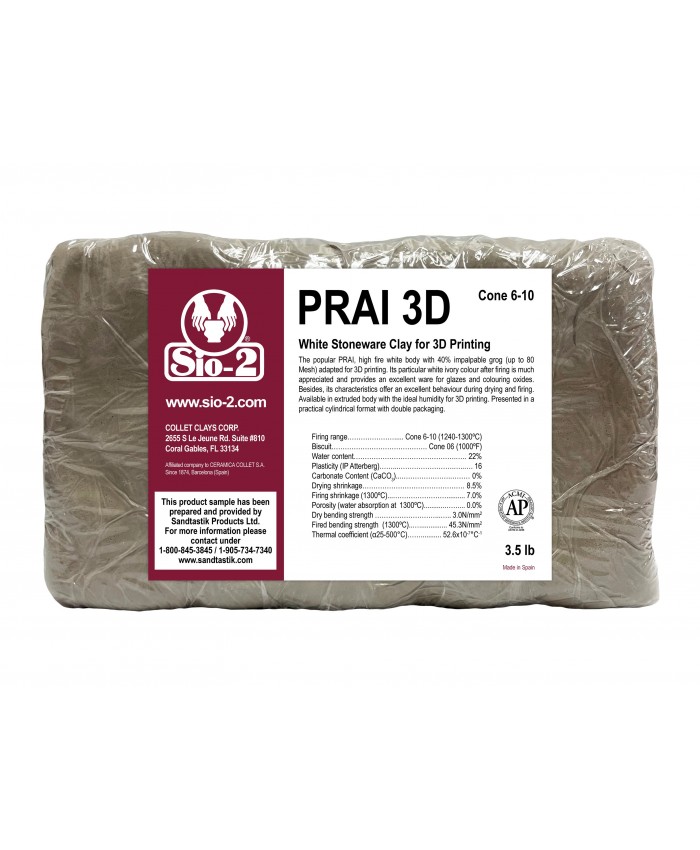 The popular PRAI, high fire white body with 40% impalpable grog (up to 80 Mesh) adapted for 3D printing. Its particular white ivory colour after firing is much appreciated and provides an excellent ware for glazes and colouring oxides. Besides, its characteristics offer an excellent behaviour during drying and firing. Available in extruded body with the ideal humidity for 3D printing. Presented in a convenient 3.5 lb size for smaller projects, or to test and see if this is the right clay for you.
