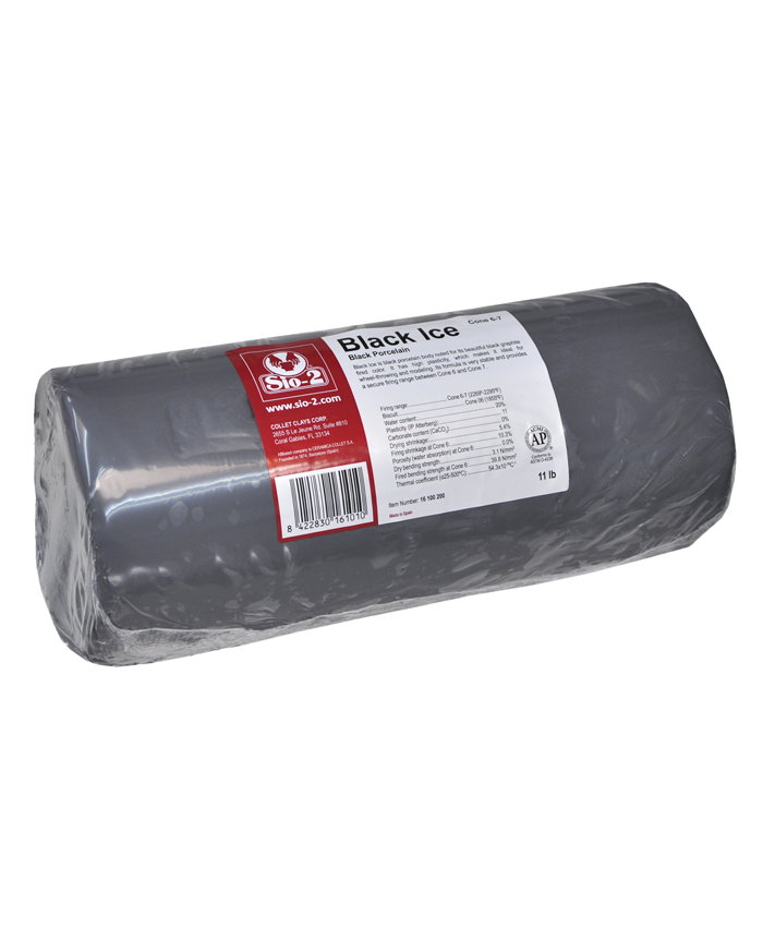 Black Ice is a black porcelain noted for its beautiful black graphite. It has high plasticity, which makes it ideal for wheel-throwing and modelling. Its formula is very stable and provides a secure firing range between 1200 and 1240°C (oxidizing atmosphere). Suitable for tableware (food-safe), according to ISO 6486. Available in extruded body (moist form). Presented in a practical 5 kg cylindrical format with double packaging. Available in a convenient 3.5 lb size to accommodate smaller projects, or to test if this is the right clay for you.