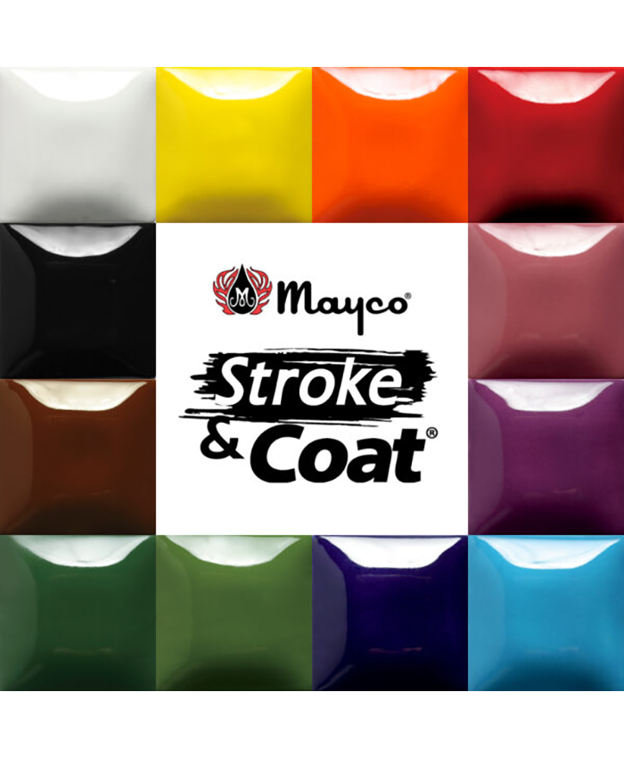 Stroke & Coat® is the industry’s most versatile product. It can be applied on wet clay, earthenware bisque or stoneware bisque, fired from cone 06 to cone 10, in oxidation or reduction and used in every decorative way imaginable. Use these glazes to create intricate, detailed designs. Colors can butt up to one another without moving and when used in a majolica process, Stroke & Coat® will not move nor blend with the colors beneath even when using light over dark. Stroke & Coat® colors are intermixable, allowing artists to create custom shades. Thin with water or media to create a wash or watercolor style of design. Because the liquid color is consistent with the fired color, artists will have no trouble visualizing finished results as they create. Stroke & Coat® fires glossy without clear glaze and is opaque with two to three coats. Because of its versatility, Stroke & Coat® is the ideal product of choice for studio, classroom, potter or fine artist.