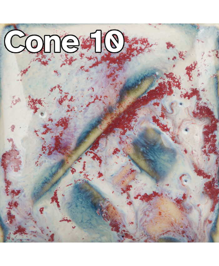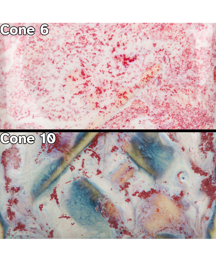 Cone 10 reduction: Pink Pearl changes to a glossy blue. Heavy crystal application may effect color results and movement.