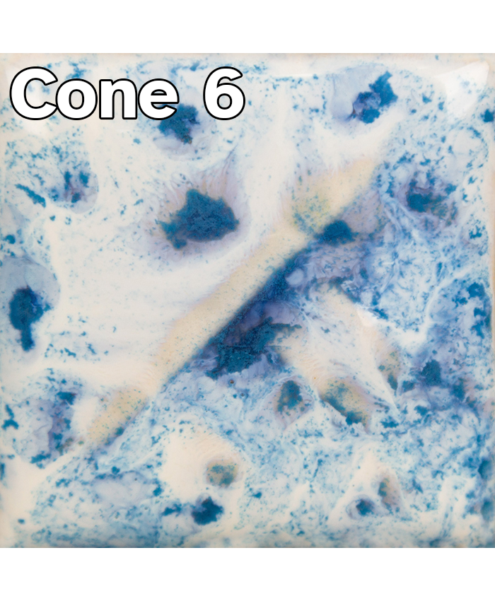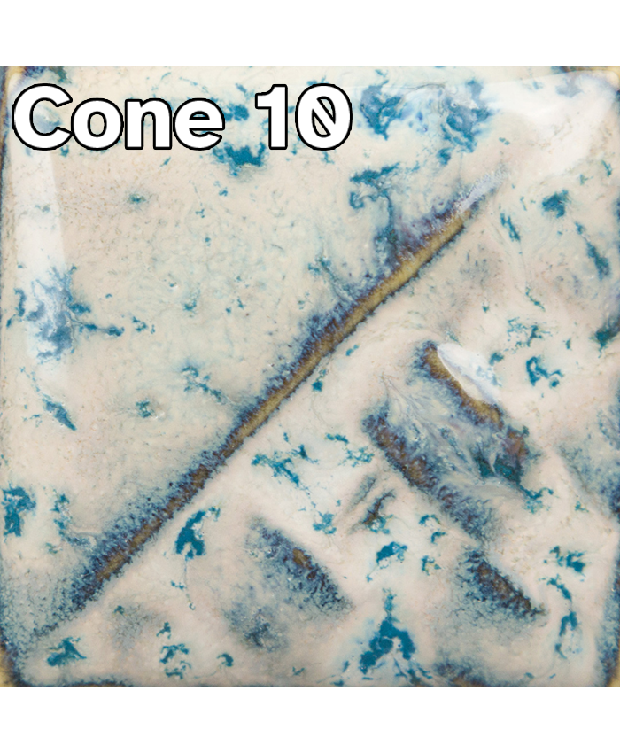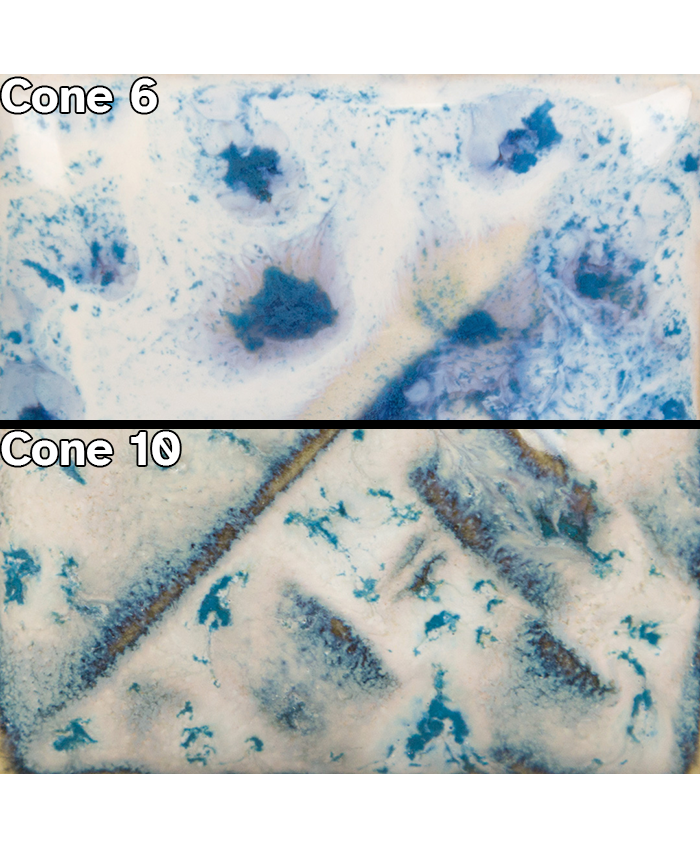 Cone 10 reduction: Tidal Wave changes to a glossy blue. Heavy crystal application may effect color results and movement.
