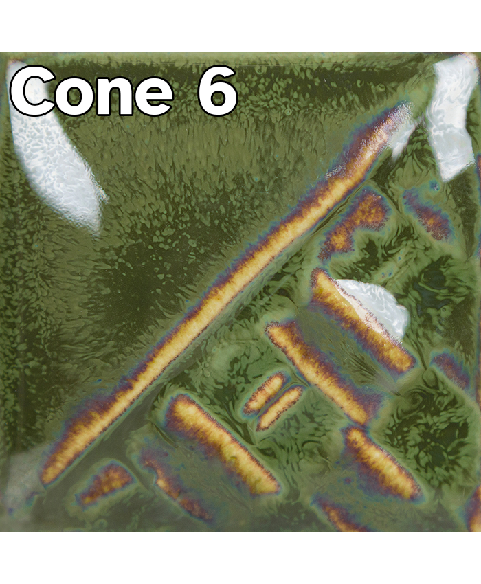 Cone 6 oxidation: Beetle Wing is a glossy, opaque green glaze that breaks over texture and has an iridescent sheen. Semi-fluid at 3 coats.