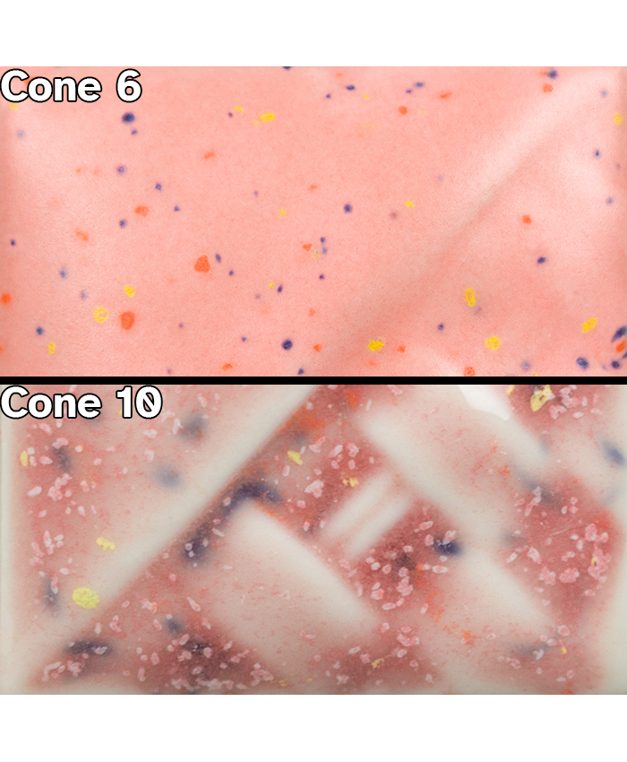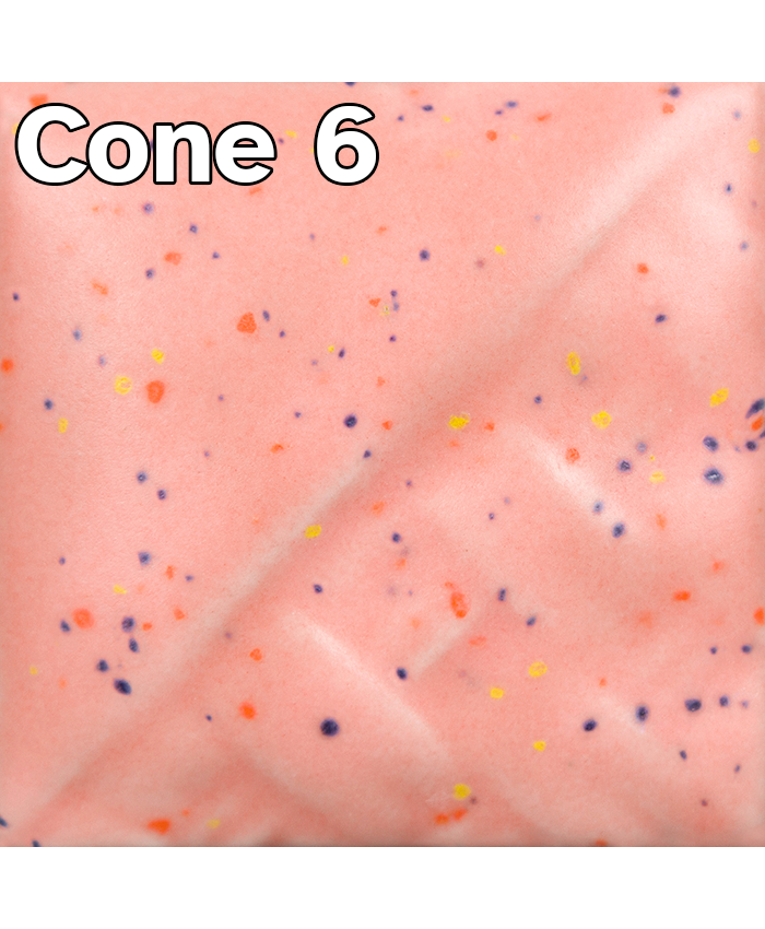 Cone 6 oxidation: Pink Speck is a satin-matte, semi-opaque light pink glaze that breaks over texture. Contains small purple, orange and yellow specks. Stable glaze.