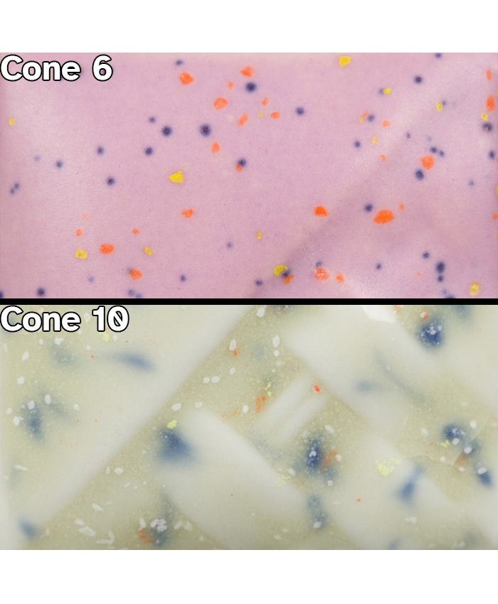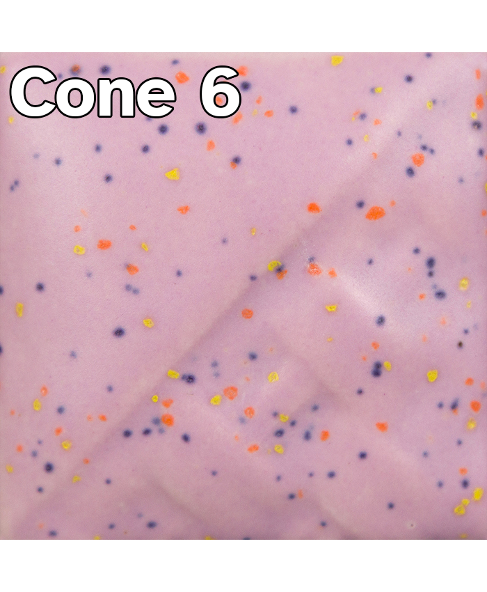 Cone 6 oxidation: Lilac Speck is a satin-matte, semi-opaque light purple that breaks over texture. Contains small purple, orange and yellow specks. Stable glaze.