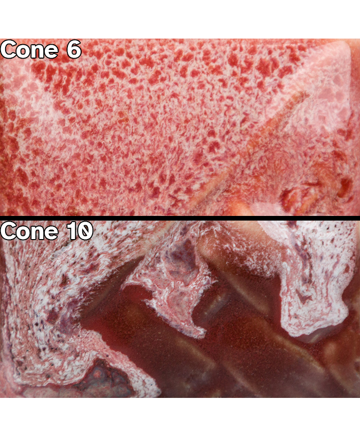 Chips shown are fired flat on a white clay body fired to cone 6 oxidation and cone 10 reduction. The choice of clay body, the thickness of glaze application, the firing process, and temperature will affect the fired results.